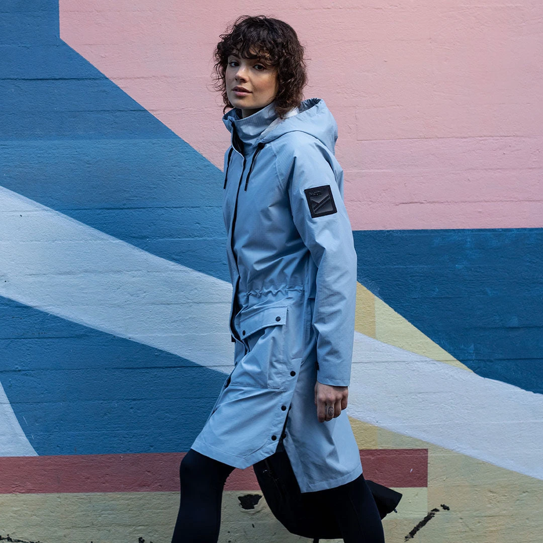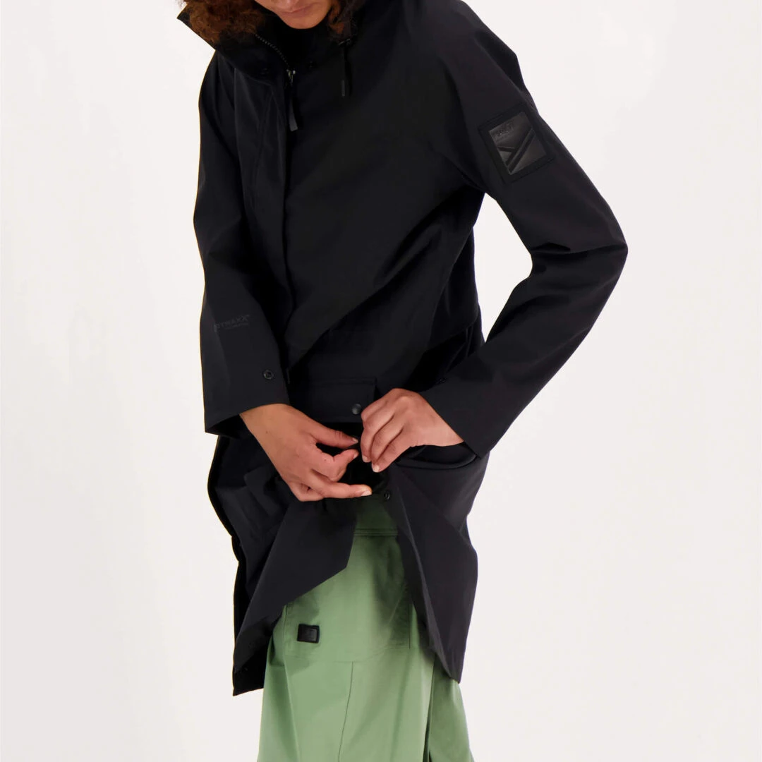 Tilavien taskujen ja sivunapitusten ansiosta Regniksessä on vaivatonta liikkua ympäri kaupunkia. Vaikka helma on pitkä, kätevä napitus tekee pyöräilystäkin helppoa. Tässä takissa on vahvat ainekset jokaisen urbaanin funktionalistin lempiparkaksi.